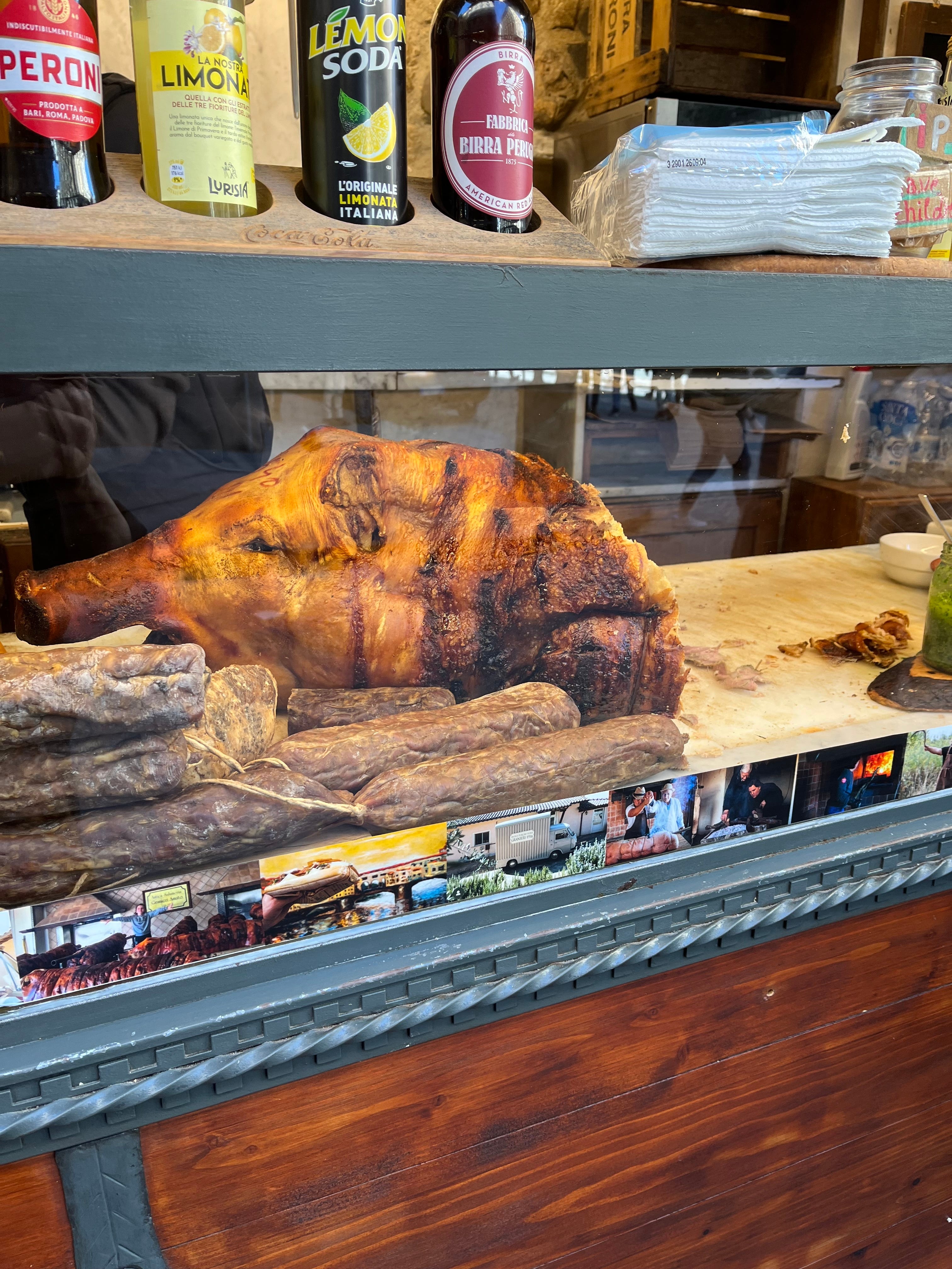 And, as we passed the shop displaying a fully-stuffed pig in the window, “Solo noi abbiamo porchetta!”