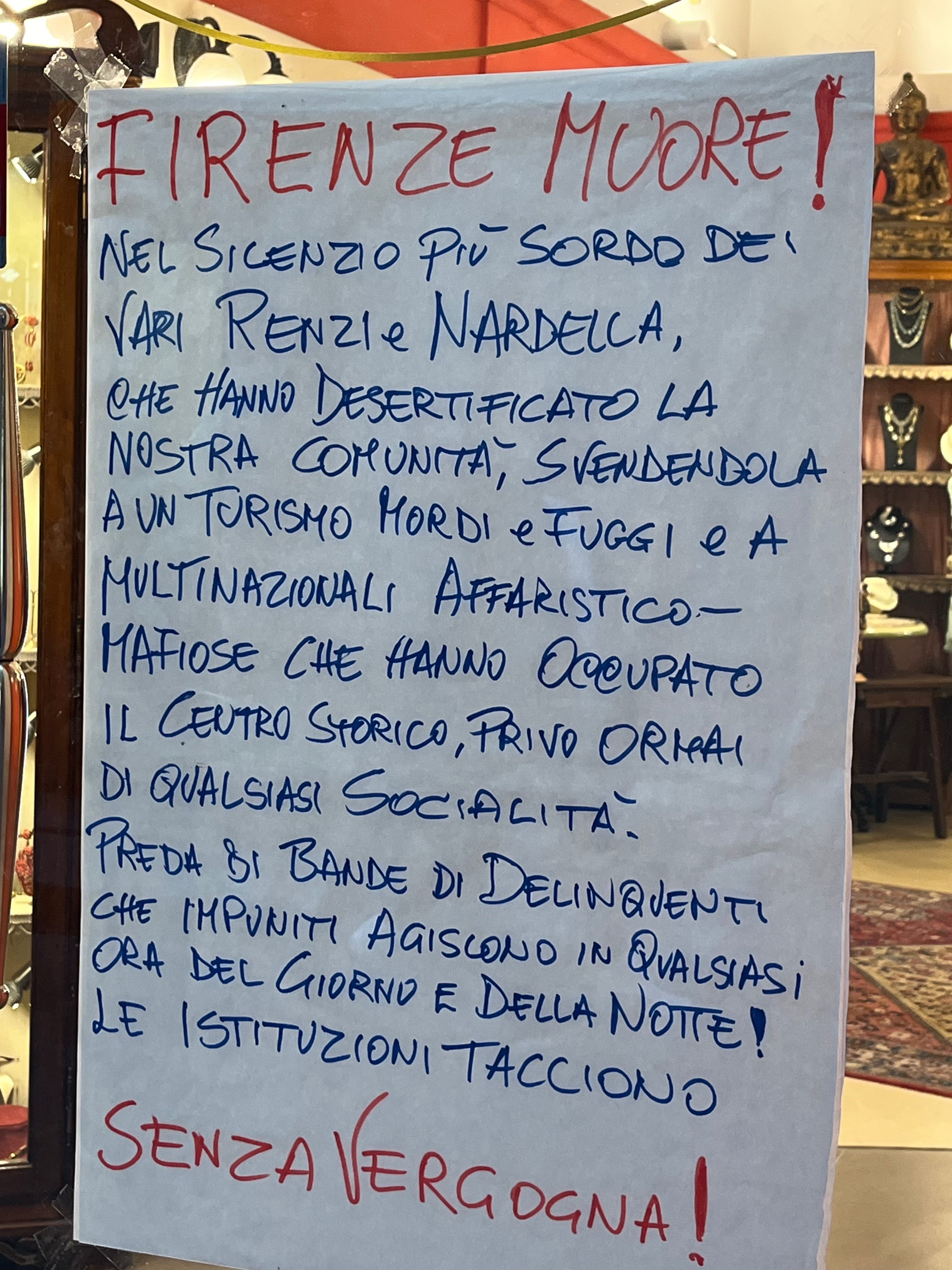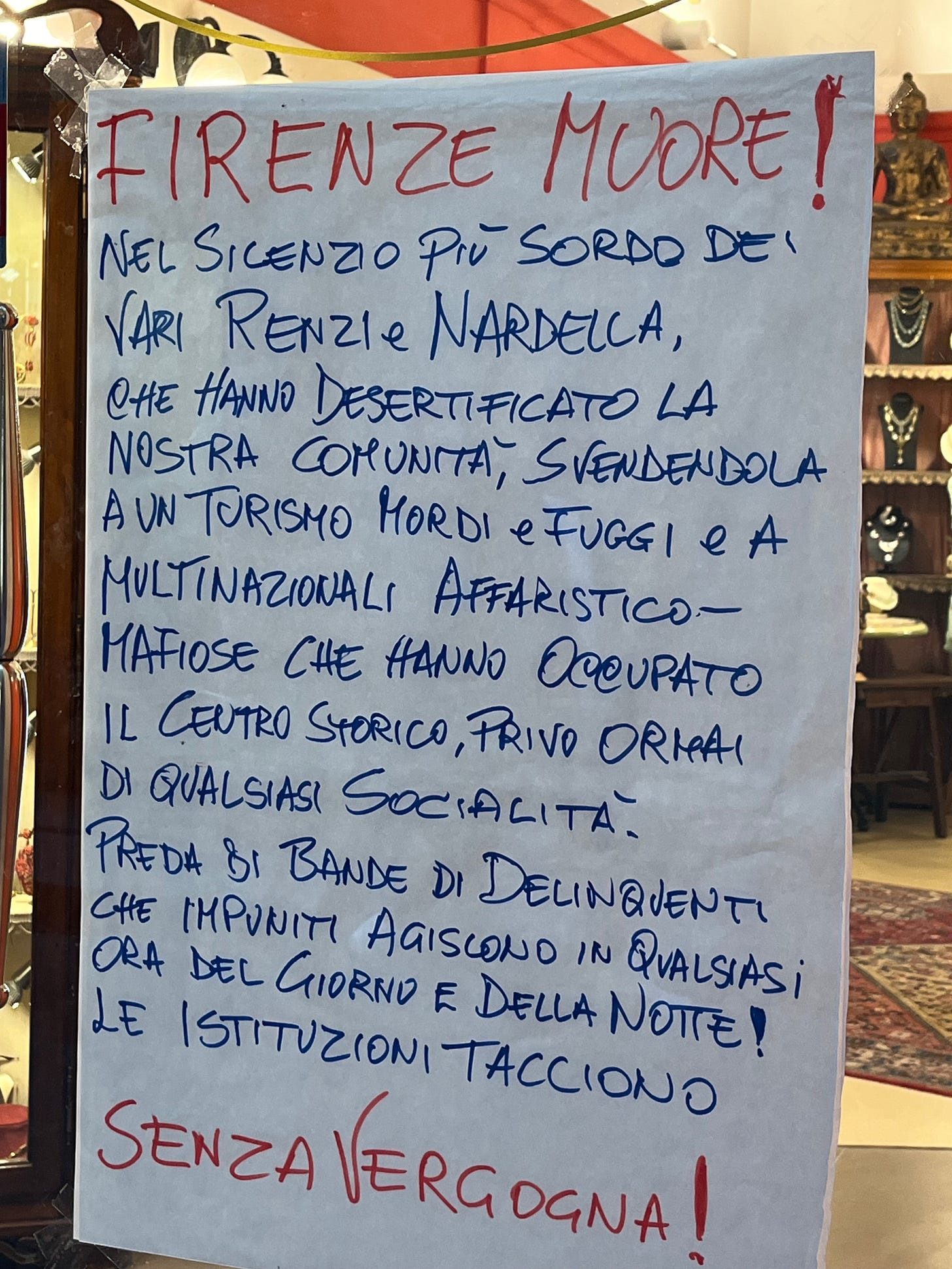 An artisan jewellery shop on one of the narrow side streets in our neighbourhood boasts a handmade sign that screams, in large red letters: Firenze muore. Florence is dying! The message blames the mayor of the city as well as the senator that represents it in the federal government, for selling out to “hit and run tourism” and international chains. It’s hard to argue when the main shopping streets are dominated by familiar names like Zara, Lush, Doc Marten and Benneton.